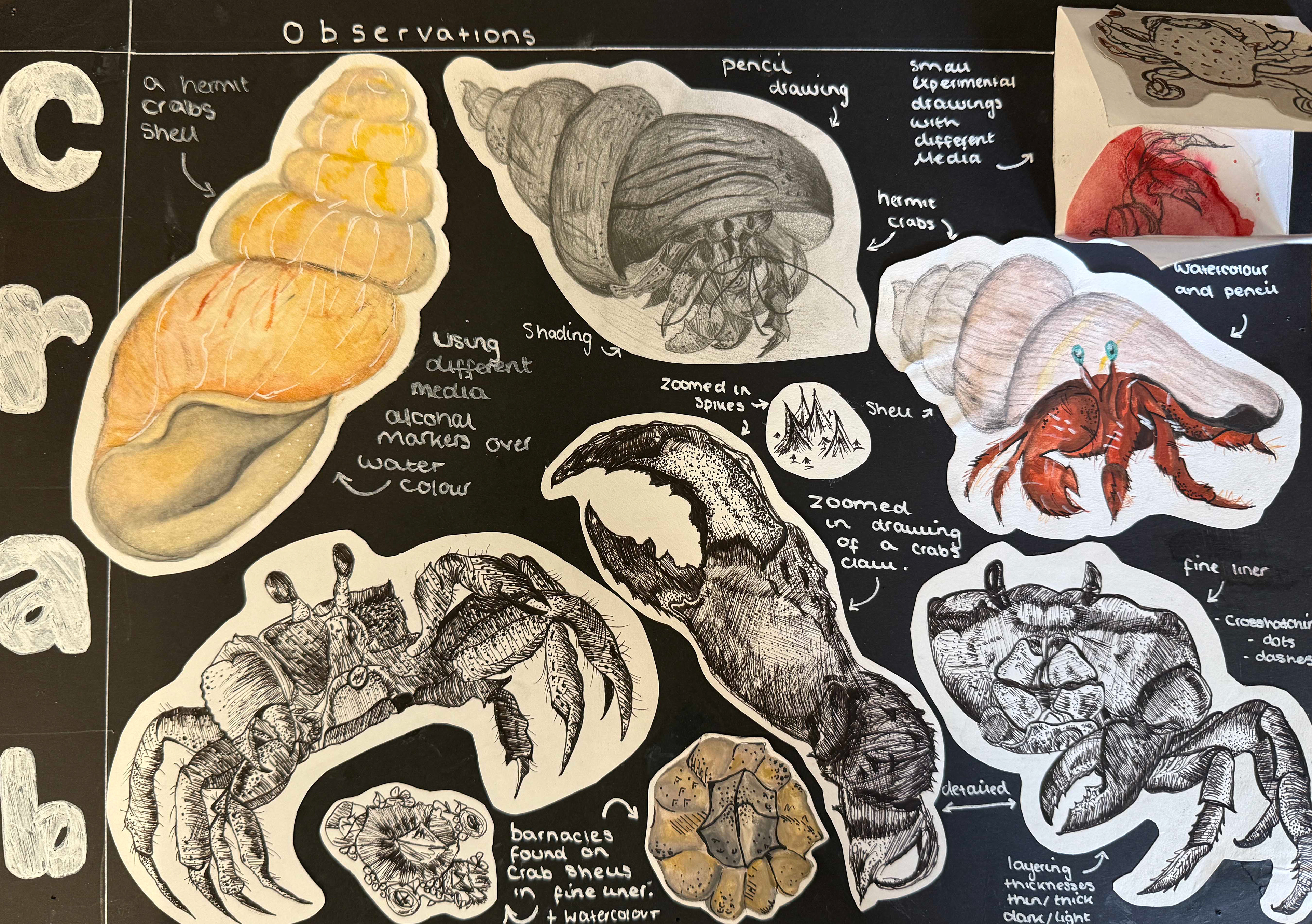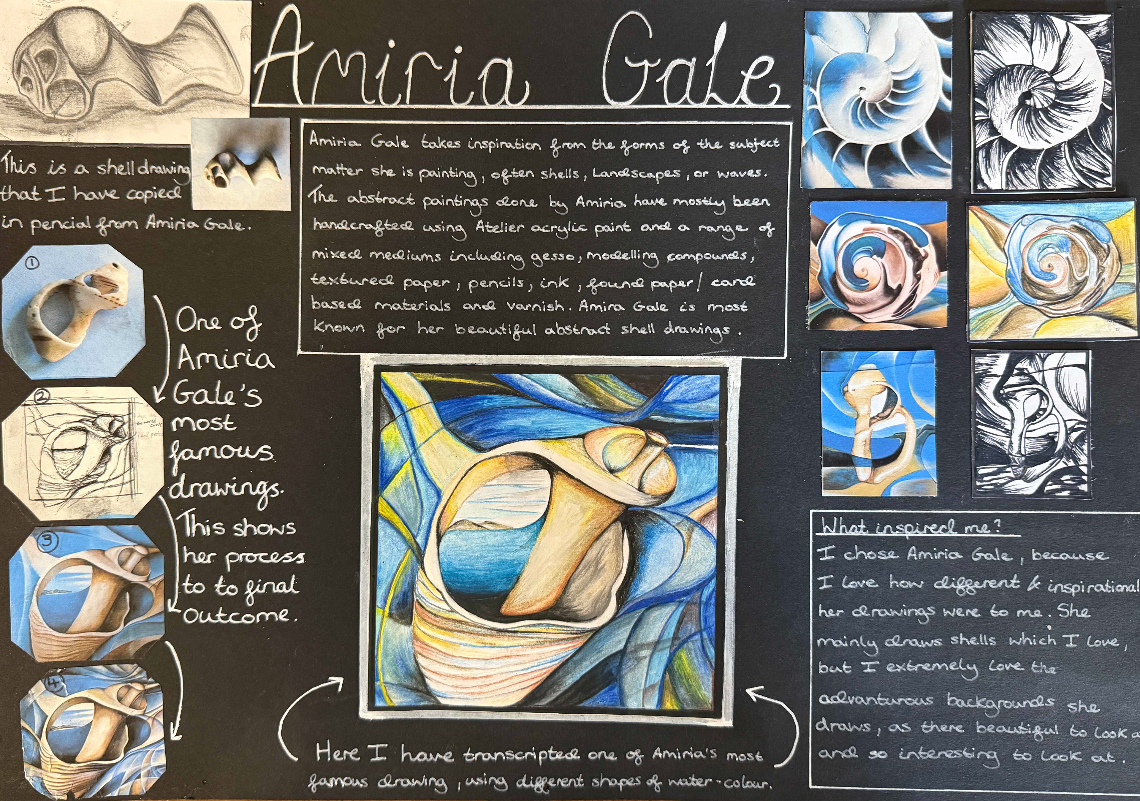 The student work on display here represents a selection of portfolio projects and exam pieces, highlighting their creativity and dedication. Each student is encouraged to explore and develop their own unique style, working in a way that best aligns with their individual strengths, interests, and artistic preferences. This approach not only fosters personal expression but also helps them build confidence and refine their skills across a variety of techniques and mediums. The result is a rich and diverse showcase of talent and innovation.